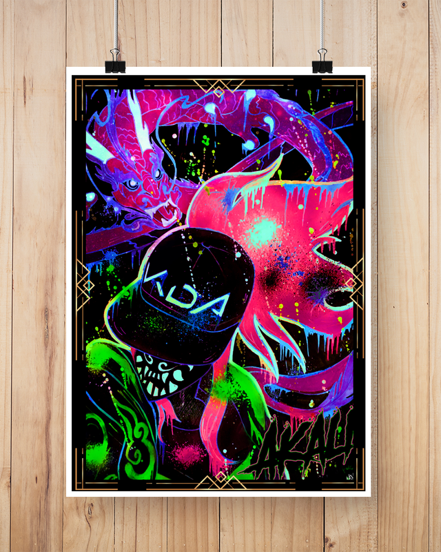 Création entièrement peinte à la main puis numérisée et reproduite grâce à une impression sur plaque ou sur papier avec un rendu couleur exceptionnel.