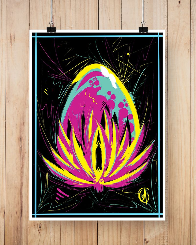Création entièrement peinte à la main puis numérisée et reproduite grâce à une impression sur plaque ou sur papier avec un rendu couleur exceptionnel.